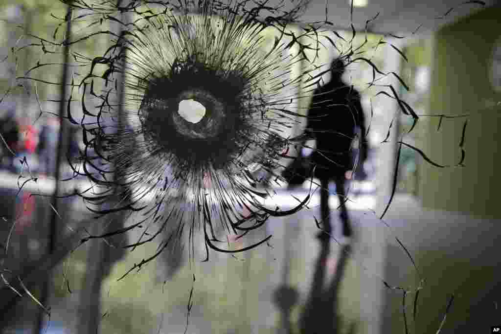 A bullet hole is pictured in a shop window on the Champs Elysees boulevard in Paris. France began picking itself up Friday from another deadly shooting claimed by the Islamic State group.