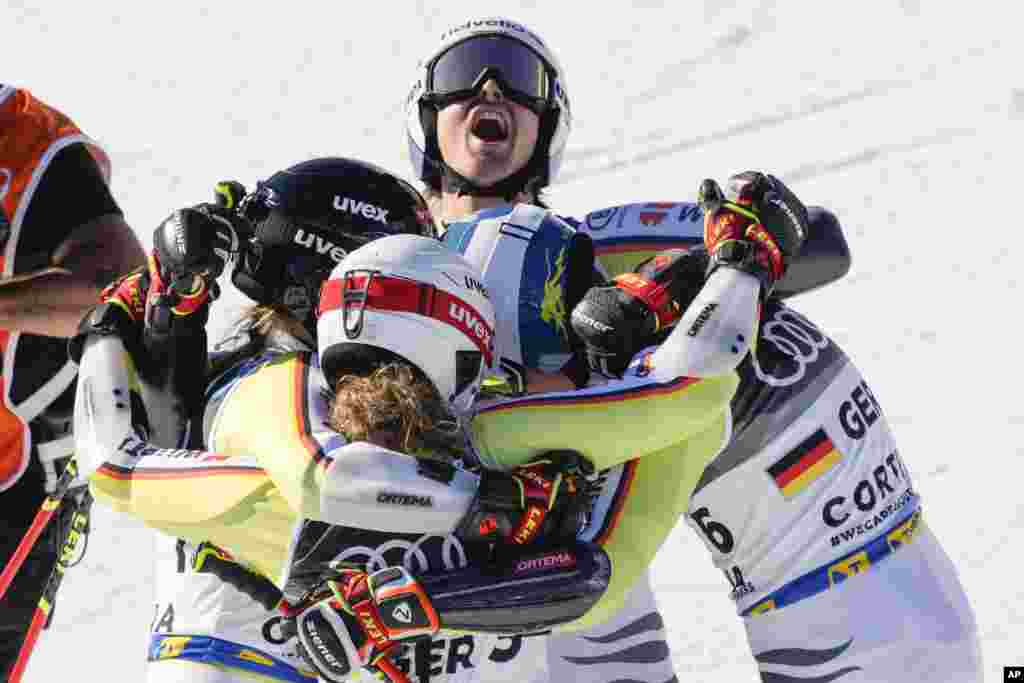 The team from Germany celebrates winning bronze medal in the mixed team parallel slalom, at the Alpine Ski World Championships in Cortina d'Ampezzo, Italy.