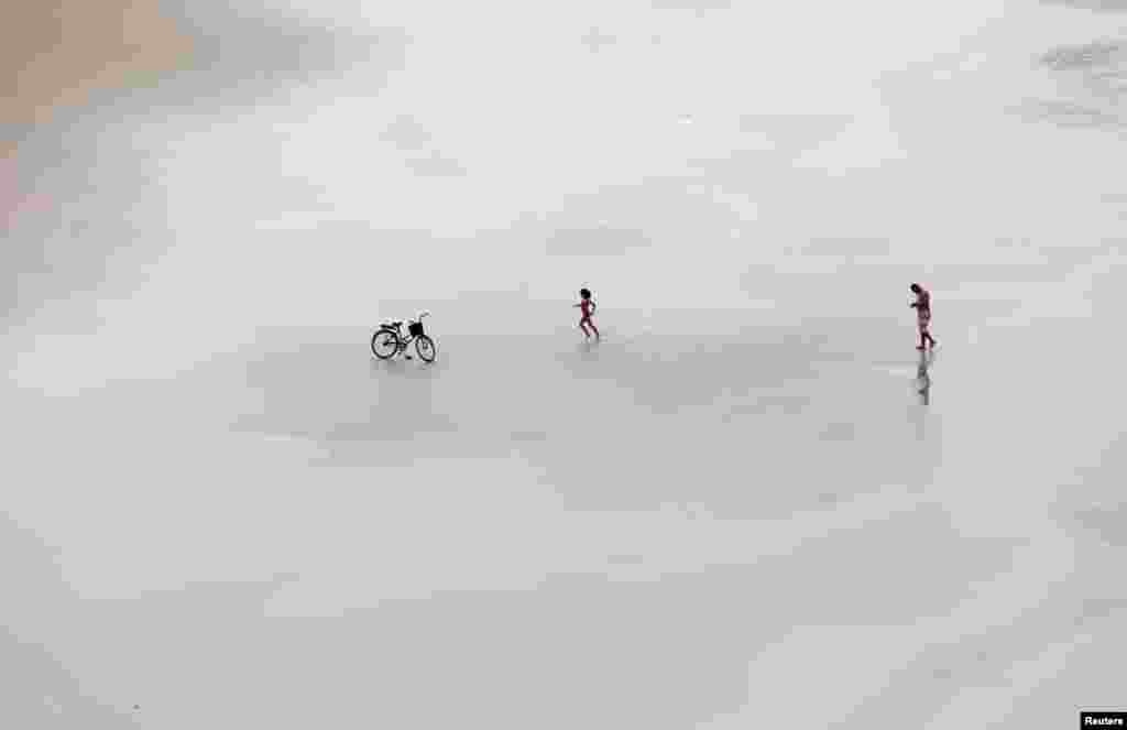 A girl runs toward her bicycle on a beach in Guaruja, Sao Paulo state, Brazil, June 18, 2019.
