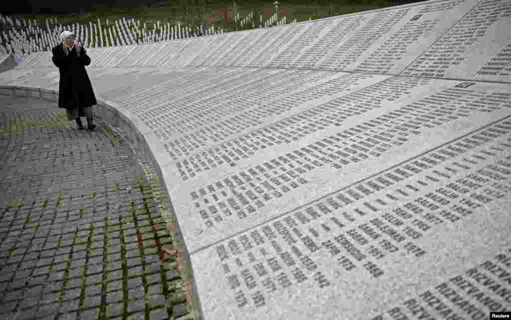Fadila Efendic prays near memorial plaques at the Potocari genocide memorial center near Srebrenica. Fadila lost her son and husband in the Srebrenica massacre. Serbia arrested eight men suspected of taking part in the 1995 Srebrenica massacre in Bosnia, the first such arrests in the ex-Yugoslav republic of accused gunmen in Europe's worst atrocity since World War II.