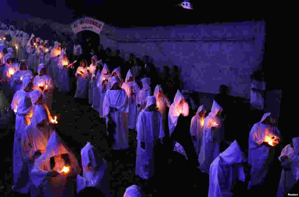 Worshipers dressed in white tunics hold candles as they participate in the "Procession of the Souls" in the city of Mariana in the Brazilian state of Minas Gerais.
