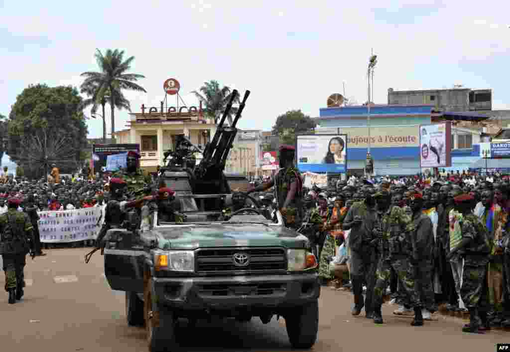 Rebel Seleka coalition soldiers arrive in Bangui. The Central African Republic's new strongman Michel Djotodia vowed not to contest 2016 polls and hand over power at the end of the three-year transition he declared after his coup a week ago.