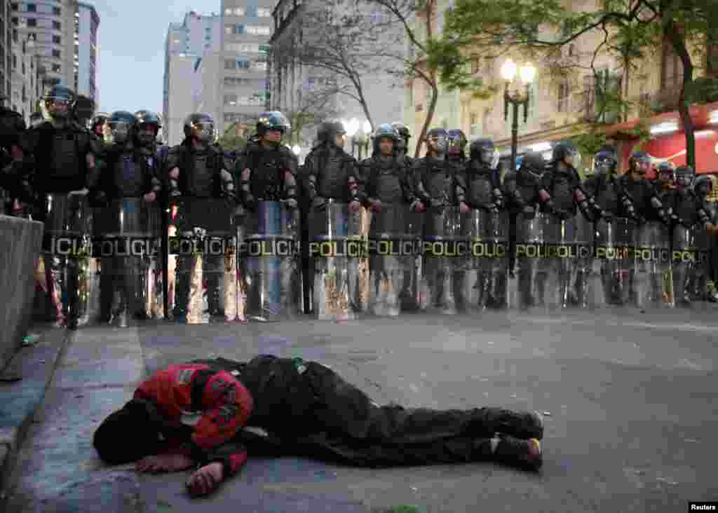 A homeless man sleeps as riot police face off against members of Brazil's Roofless Movement during a protest against their forced eviction from an abandoned, empty building in downtown Sao Paolo in which they were living.