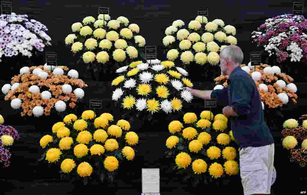 A person puts the finishes touches to a display during the 2021 RHS Chelsea Flower Show in London.